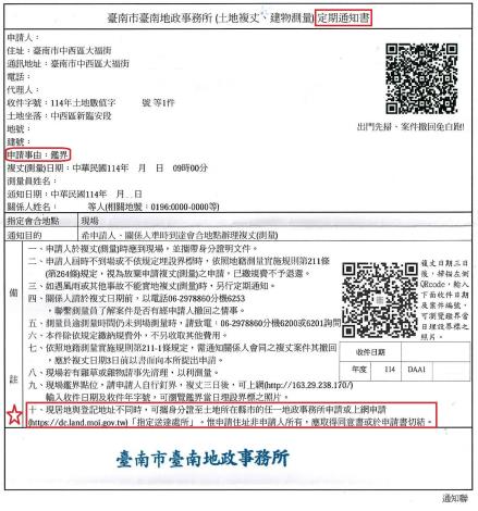 臺南地政事務所主任林建良表示,雖然內政部推出此措施便利民眾,除於地政事務所隨民眾申請登記案件與假日宣導外,為擴大宣導範圍,特別將此訊息同步納入鑑界複丈通知書,主動通知鄰地關係人,確保更多異地居住的土地所有權人了解此新制度,進而申請「指定送達處所」,保障自身權益,避免因無法即時收受公文而影響相關權益。